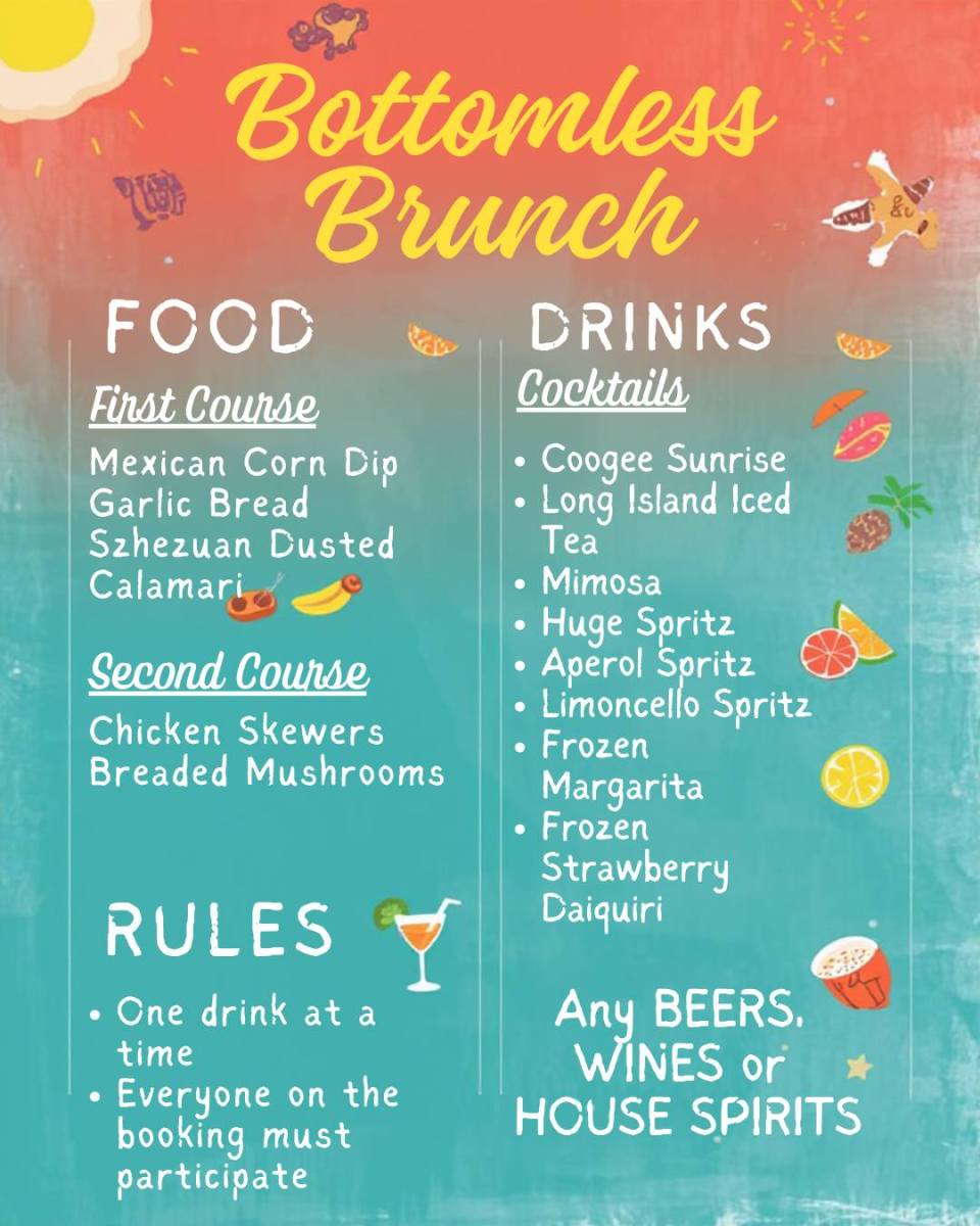 Bottomless brunch is available every day for lunch for groups of 2 or more.